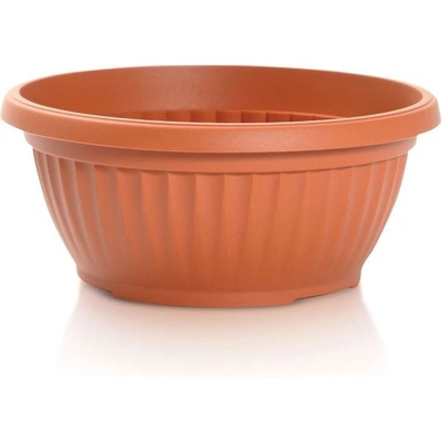 Plastová žardinka v barvě terakoty s vlisovanými třemi proužky v horní i v dolní části se zahnutým horním okrajem směrem ven. O průměru 20 cm s výškou 8 cm. Vhodná k použití v...