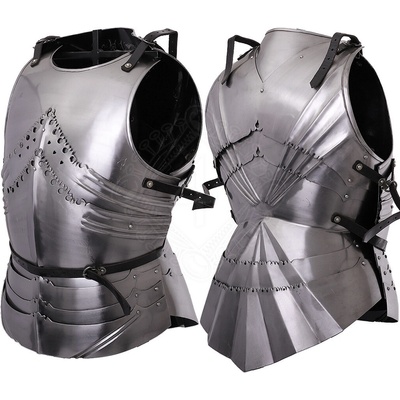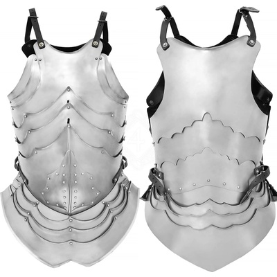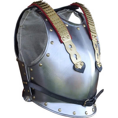Přední kyrys je vyrobený z leštěné měkké oceli o tloušťce 1 mm, vhodné pro fantasy LARP či divadlo. Upevňuje se pomocí dvou řemenů o šířce 4 cm překřiženým na zádech, díky tomu...