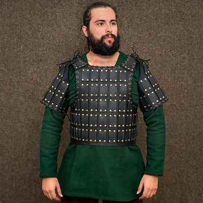 Kožená brigantina "Bohemond", nýtovaný kyrys Ochrana a styl pozdního středověku Kyrys je vyroben z kvalitní černé kůže. Jeho dominantou je hustá mřížka vertikálně orientovaných...