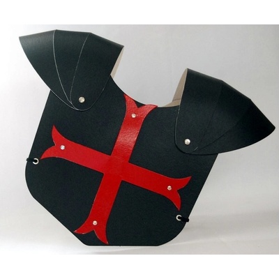 Rytířský kyrys Rytířský kyrys Rytířský kyrys z tuhého papíru, na bocích s tkanicemi v černé barvě zdobený červeným křížem. Velikost ramen cca 55 cm. Velikost brnění 26x29 cm.