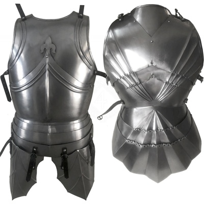 Gotický kyrys "Fleur-de-lis" s plátovými šorci, ocel 1,2 mm Detailní popis a konstrukce Tato replika pozdně středověkého kyrysu je pečlivě vyrobena z ocelového plechu o síle 1,2...