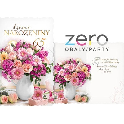 Přání s textem k 65-tým narozeninám s obálkou:Rozměr: 114 x 190 mm (ve složeném stavu)Text na přední straně:Krásné narozeniny65Text uvnitř přání:Hodně štěstí, hodně lásky,a na...