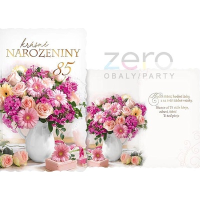 Přání s textem k 85-tým narozeninám s obálkou:Rozměr: 114 x 190 mm (ve složeném stavu)Text na přední straně:Krásné narozeniny85Text uvnitř přání:Hodně štěstí, hodně lásky,a na...