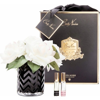 Luxusní vonná kytice, která nikdy nezvadne. Pět ručně vyrobených růží v elegantní černé váze s motivem rybí kosti a dvěma parfémy – Pink Peony a Queen of the Night. Okouzlující...