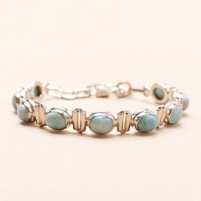 Krásný, blankytně modrý náramek ze vzácného přírodního čistě modrého larimaru z Dominikánské republiky. Larimar uklidňuje při stresu, potlačuje obavy a svou jemnou modrou...