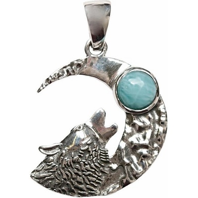 Krásný designový stříbrný přívěsek s kabošonem larimaru. Ag 925. Symbol vlka a měsíce je silným spojením divoké přírody, instinktů a mystiky. Kupujete přímo vyobrazený...