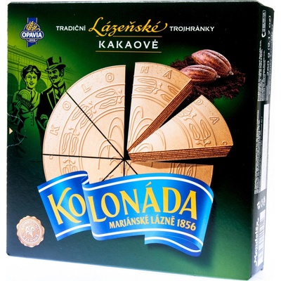 Opavia Kolonáda Lázeňské oplatky trojhránky 1x260g Složení Pšeničná mouka, Cukr, Plně ztužený palmojádrový tuk, Laktóza (z mléka), Palmový tuk, Kakaový prášek se sníženým...