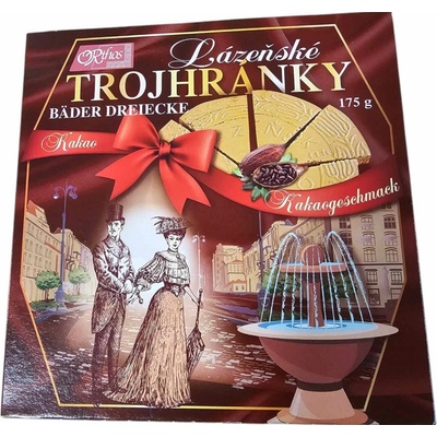 Tradiční lázeňské trojhránky s kakaovou náplní. Složení: pšeničná mouka, cukr, plně ztužený palmojádrový tuk, laktóza (z mléka), palmový tuk, kakaový prášek se sníženým...