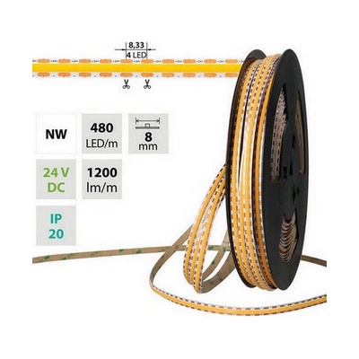LED pásek SMD2216, 2800-3100K (teple bílý WW), 7,2W, 120LED, 585lm/m, segment 50mm, 6LED/segment, IP20, DC 24V, životnost 54000h, šíře 4mm, bílý PCB pásek, max. délka pásku při...