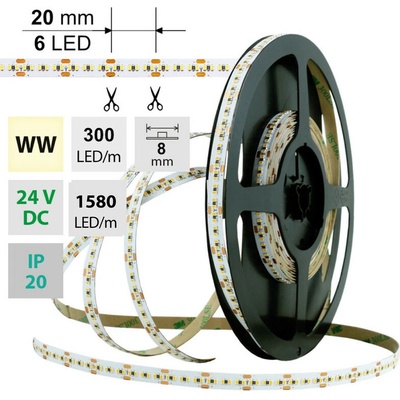 LED pásek SMD2216, teplá bílá (3000K), 18W, 300LED, 1580lm/m, segment 20mm, 6LED/segment, IP20, DC 24V, životnost 54000h, šíře 8mm, bílý PCB pásek, max. délka pásku při...