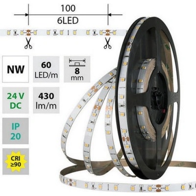 LED pásek SMD2835, neutrální bílá (4200K), 4,8W, 60LED, 430lm/m, CRI>90, segment 100mm, 6LED/segment, IP20, DC 24V, životnost 54000h, šíře 8mm, bílý PCB pásek, max. délka pásku...