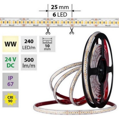 Stmívatelný LED pásek SMD2835, teplá bílá (3000K), 6W, 240LED, 500lm/m, CRI>90, segment 25mm, 6LED/segment, IP67, DC 24V, životnost 50000h, šíře 10mm, bílý PCB pásek, max....