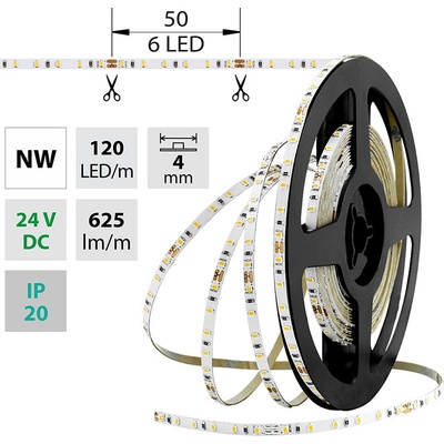 LED pásek SMD2216, neutrálně bílá (4200K), 7,2W, 120LED, 625lm/m, segment 50mm, 6LED/segment, IP20, DC 24V, životnost 54000h, šíře 4mm, bílý PCB pásek, max. délka pásku při...