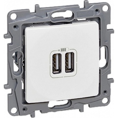 Legrand 764594 dvojitá USB nabíječka v bílé barvě ve stylu Niloé. Upevnění pomocí šroubů. Obsahuje šroubové svorky.