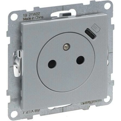 Legrand 721189 jednonásobná zásuvka s USB-C nabíjením v barvě hliníku ve stylu Suno. Upevnění šrouby nebo drápky. Obsahuje bezšroubové svorky.