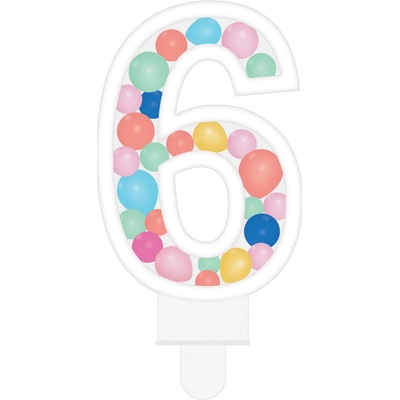 Samostojný fóliový balónek číslo 6 s barevnými lentilkami Balónek je vhodný na dětské narozeninové oslavy nebo jiné příležitosti Mnohabarevné puntíky na modrém podkladě působí...
