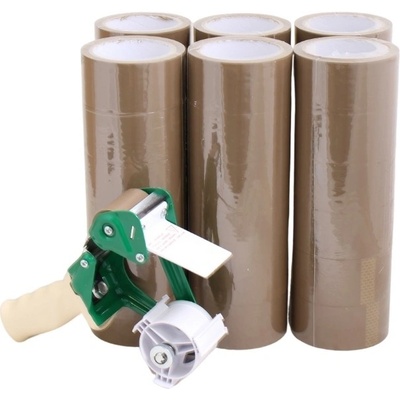 Sada hnědých lepících pásek šíře 48 mm a kovového odvíječe pásek s brzdou. Vlastnosti lepící pásky Lepicí páska má šíři 48 mm a návinu 66 m, sílu 25 mikronů a lepidlo akryl....