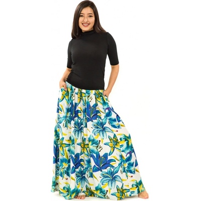 Maxi sukně s kapsami Lilie - bílá s tyrkysovou Luxusní dámská maxi sukně s kapsami je ideální na každou příležitost. Kromě slavnostnějších událostí se nabízí i civilnější, ale...