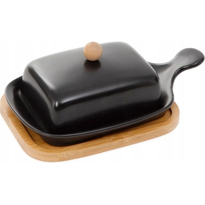Elegantní černá keramická máslenka s dřevěným knobem pro praktické uchovávání a servírování másla. Kompaktní rozměry 16 × 12,5 × 7 cm, klasický tvar vhodný do každé kuchyně,...