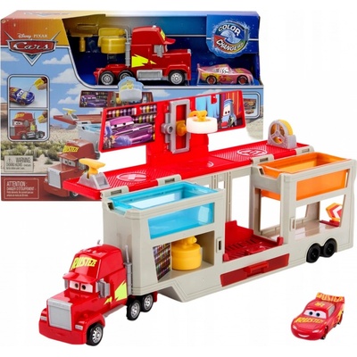 Cars Auta Transporter Maniek Mobilní lakovač Transportér vozidel Maniek ze známé pohádky Auta. Jedná se o mobilní lakýrník, který dokáže měnit barvu auta, které je součástí sady cikcaku mcqueen. Kabina se odděluje od návěsu, na kterém je ukryto celé lakovací zařízení....