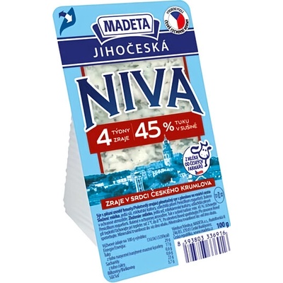 -- Jihočeská Niva 45 % 100g. Zrající 4 týdny. Skvěle se hodí do teplé i studené kuchyně.Lahodný sýr typu rokfór s ušlechtilou modrozelenou plísní uvnitř hmoty.