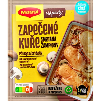 ZÁKONNÝ NÁZEV POTRAVINY Maggi Nápady Zapekané kura so šampiňónmi a smotanou. Dehydratovaný výrobok. Základ pokrmu. SLOŽENÍ sušený glukózový sirup, zemiakový škrob, jedlá soľ, maltodextrín (z kukuričného škrobu), sušené huby 6,3 % (šampiňóny), sušený šampiňónový výťažok...