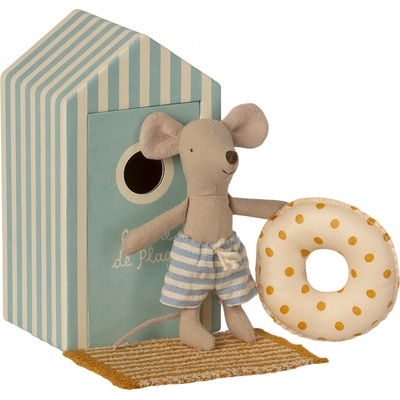 Maileg Myšák na pláži s domečkem Little Brother, modrá barva, papír, textil. Teplý písek hřeje do tlapek, mořský vánek otáčí slunečníkem a neposedné vlnky volají každého, kdo by...