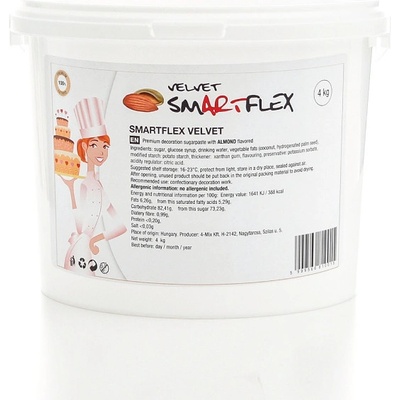 Smartflex velvet mandle 4 kg je sněhově bílá, extra pružná hmota s vynikajícími vlastnostmi, vhodná zejména k potahování dortů a modelování figurek. Při modelaci i potahování...