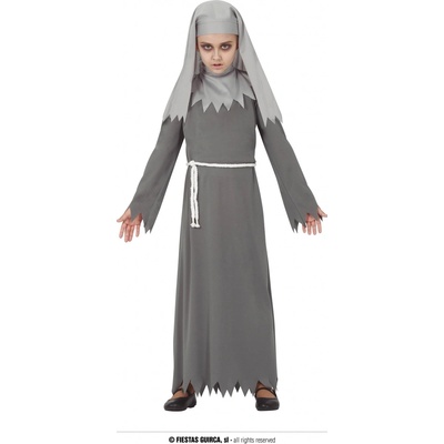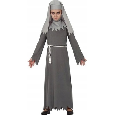 Dětský kostým Gotická jeptiška změní vaši holčičku k nepoznání. Obsahuje šaty, pokrývku hlavy a bílá šňůrka kolem pasu. Šaty jsou v podobě dlouhé šedé róby s límečkem, cípatými rukávy a spodní částí šatů. Šedá pokrývka hlavy je délky pod ramena. Velikost 7-9 let