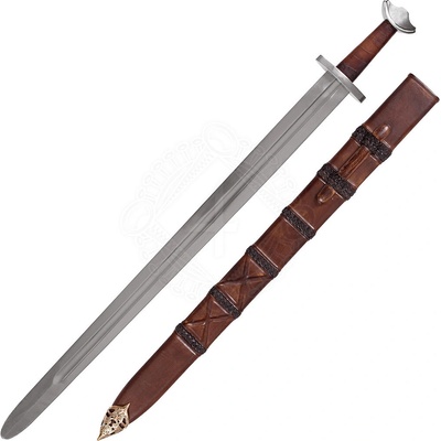 Meč Období Vendel s pochvou, mosazný jílec Svým tvarem je tento jednoruční meč klasickým příkladem severské zbraně. Dvousečná čepel s širokým žlábkem je kovaná z pružinové oceli...