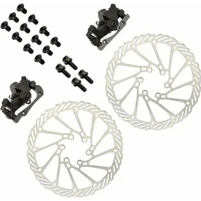 Kompletní sada mechanických kotoučových brzd včetně kotoučů. Sada obsahuje: - 2x kotouč 160 mm - 2x třmen brzdy včetně destiček - 4x šroub pro uchycení třmenu - 12x šroub...