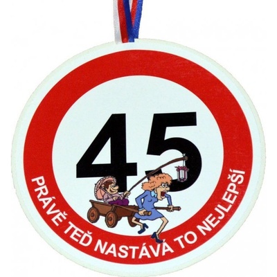 Medaile o průměru cca 12,5 cm je vyrobena z překližky. Medaile obsahuje stuhu v barvách trikolory pro zavěšení na krk nebo vystavení na zeď. Na obrázku je muž na voze, kterého veze žena. Dále je tu číslice 45 a nápis: "Právě teď nastává to nejlepší." Na oslavě...