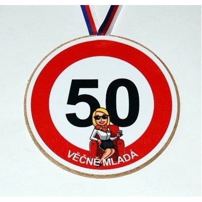 Medaile o průměru cca 12,5 cm je vyrobena z překližky. Medaile obsahuje stuhu v barvách trikolory pro zavěšení na krk nebo vystavení na zeď. Na obrázku je jásající žena s číslem 50 a nápisem: "Věčně mladá." Na oslavě medailí krásně označíte oslavence.