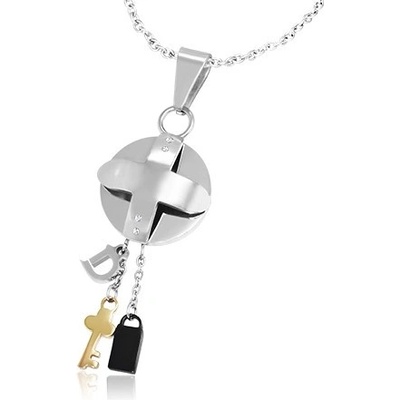 Přívěsek z oceli s křížem a zirkony na kruhovém podkladu, malý klíček a zámek.