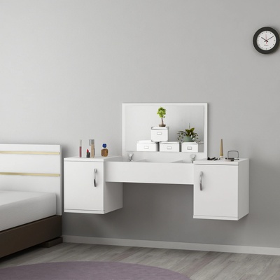 Nástěnný toaletní stolek se zrcadlem. Díky jednoduchému designu se hodí do každého interiéru. Provedení v bílé barvě. Disponuje dvěma bočními skříňkami a úložným prostorem uprostřed. Vyrobeno z laminované dřevotřísky. Tloušťka materiálu: 1,8 cm.