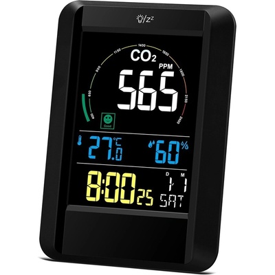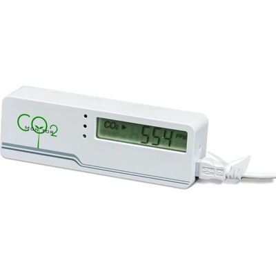 Popis Designový detektor CO2 (monitor 'vydýchaného vzduchu'), svým provedením je vhodný např. do bytu či kanceláře, na displeji zobrazuje úroveň CO2, teplotu, vlhkost,...