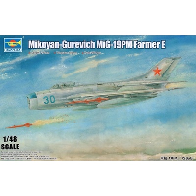 Trumpeter 02804 MiG-19PM Farmer E 1:48. Rozměr balení cca 42 x 27 x 6 cm (D x V x Š). Délka 273 mm, šířka 183 mm, počet dílků 230.