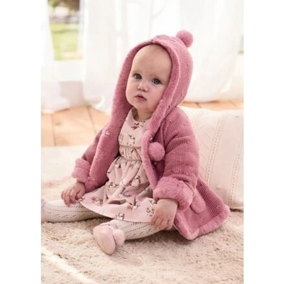 Luxusní pletený kojenecký kabátek s kapucí a hřejivou podšívkou z textilního heboučkého kožíšku od módní značky Mayoral z kolekce newborn. svetr - kabátek v tmavě růžové barvě s...