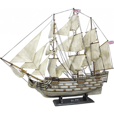 Luxusní dřevěná replina velké britské válečné lodě s mnoha plachtami na dřevěném podstavci o délce 86 cm a výšce 74 cm.Detailně propracovaný model lodě z dávných časů vhodný...