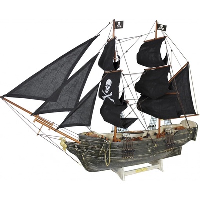 Dokonalá dřevěná replina pirátské lodě Korzár s šedým trupem a typickými černými plachtami s lebkou na podstavci o délce 78 cm a výšce 60 cm.Nádherně zpracovaný model pirátské...
