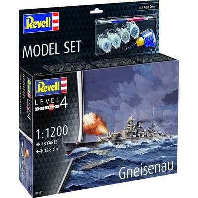 Revell Gneisenau Model Set lodi 1:1200, 48 dílů + barvy + lepidlo + štětec Plastikový model lodi BATTLESHIP GNEISENAU REVEL 65181 ke slepení. Velikost: 1:1200; 188mm. Balení...