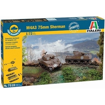 Italeri Sherman Jumbo M4A3E2 Model Auto Set 1:72 Model auta ke slepení. Velikost: 1:72; 83mm. Obtížnost: 3. Model neobsahuje barvy ani lepidlo, SADA OBSAHUJE DVA RYCHLE ZESTAVITELNÉ MODELY - POTISKY PRO 1 VERZI Informace o originálu: M4 Sherman (oficiální označení...
