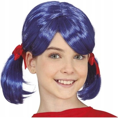 MODRÁ PARUKA S DĚTSKÝMI PONÍKY Dětská paruka v modré barvě. Vlasy jsou lesklé, rovné, uvázané do dvou culíků po stranách. Poníci jsou ozdobeni červenými mašličkami. Hustá ofina česaná do strany. Paruka vyrobená ze syntetických vlasů. Velikost. Na ostatních našich...