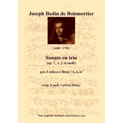 Nástrojové obsazení: flauto I., II., basso continuo. Prelude - Gravement, Fugue - Gay, Grave - Gratiuesement, Vivement Ukázka: