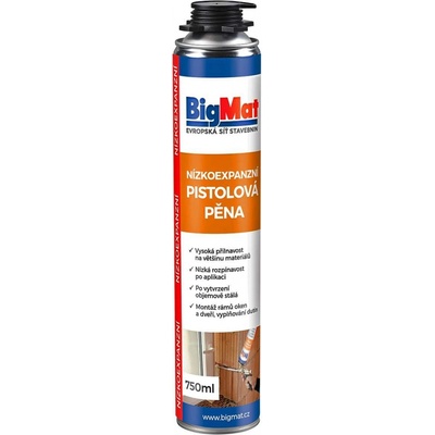 Montážní pěna nízkoexpanzní BigMat pistolová, 750ml je jednosložková polyuretanová montážní pěna s nízkou druhotnou expanzí Pro vyplňování spár při montáži okenních rámů a...