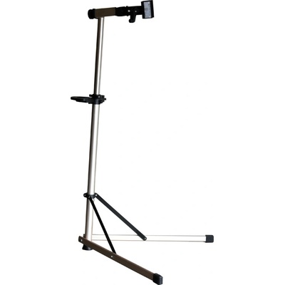 Rozkládací stavitelný montážní hliníkový stojan na dvojnožce, s poličkou a držákem přední vidlice. 360° otočná horní čelist pro průměr trubky max 40 mm materiál: hliník...