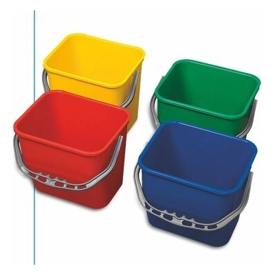 Plastový hranatý kbelík o objemu 6L, hodí se jako úložný prostor k úklidovému vozíku. barva: modrá, červená délka: 22 cm výška: 24 cm šířka: 29 cm