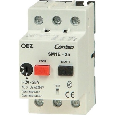 Spolehlivá ochrana proti přetížení elektromotoru. Rozsah nastavení proudu přetížení 1,6-18,0A Montáž na DIN listu. Použitelný jako hlavní jistič. Testovací tlačítko.