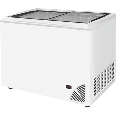 Truhlicová mraznička 444 litrů; statický chladicí systém (boční pěnový výparník a kondenzátor); 2 posuvná skleněné víka (možno doobjednat zámek); vypínatelné vnitřní přední...