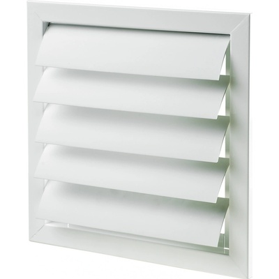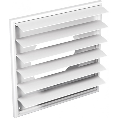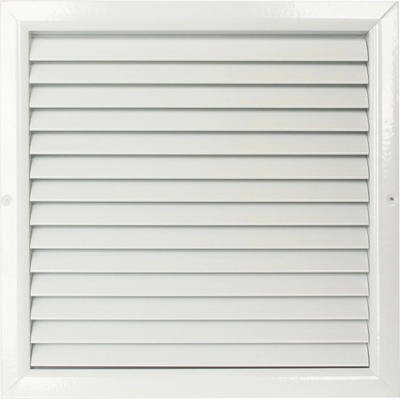 Bílá větrací čtyřhranná mřížka rozměru 300 x 300 mm, vyrobena z vysoce extrudovaného hliníku s pevnou žaluzií, pro montáž do stavebního otvoru, k odvětrání WC, koupelny,...